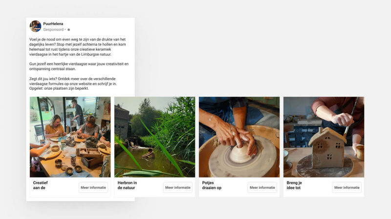 In de social media campagnes om de kinderkampen te promoten, toonden we ouders welke activiteiten allemaal op het programma stonden. Heel puur en echt. De campagnes voor de keramiek vierdaagse speelden eerder in op de behoeften die geïnteresseerden in vervulling kunnen zien gaan bij Puur Helena.